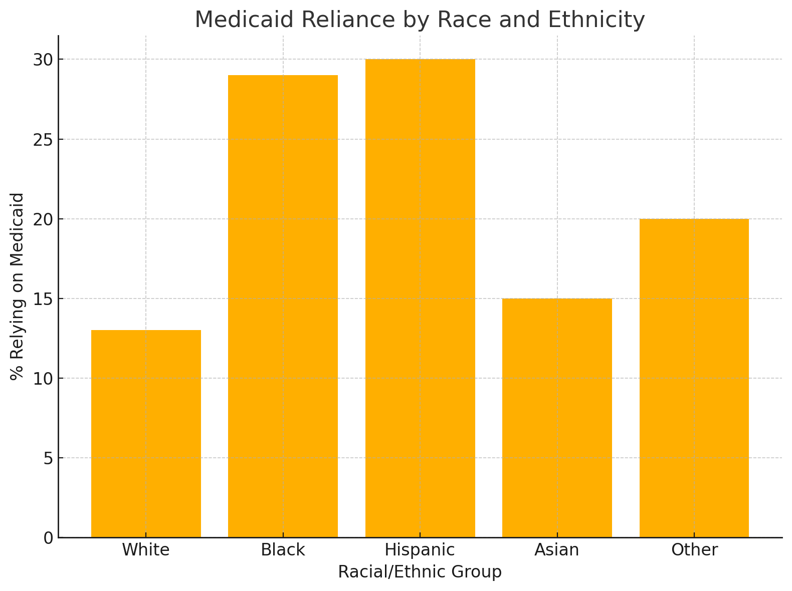 (Chart: Reliance on Medicaid by Race and Ethnicity) – This bar chart shows the share of individuals (and children) on Medicaid or CHIP by racial/ethnic group. It highlights that Black and Hispanic populations have around double the reliance on Medicaid compared to white populations (nearly 30% of Black and Hispanic Americans versus 13% of white Americans). This underscores that large Medicaid cuts would disproportionately affect communities of color.