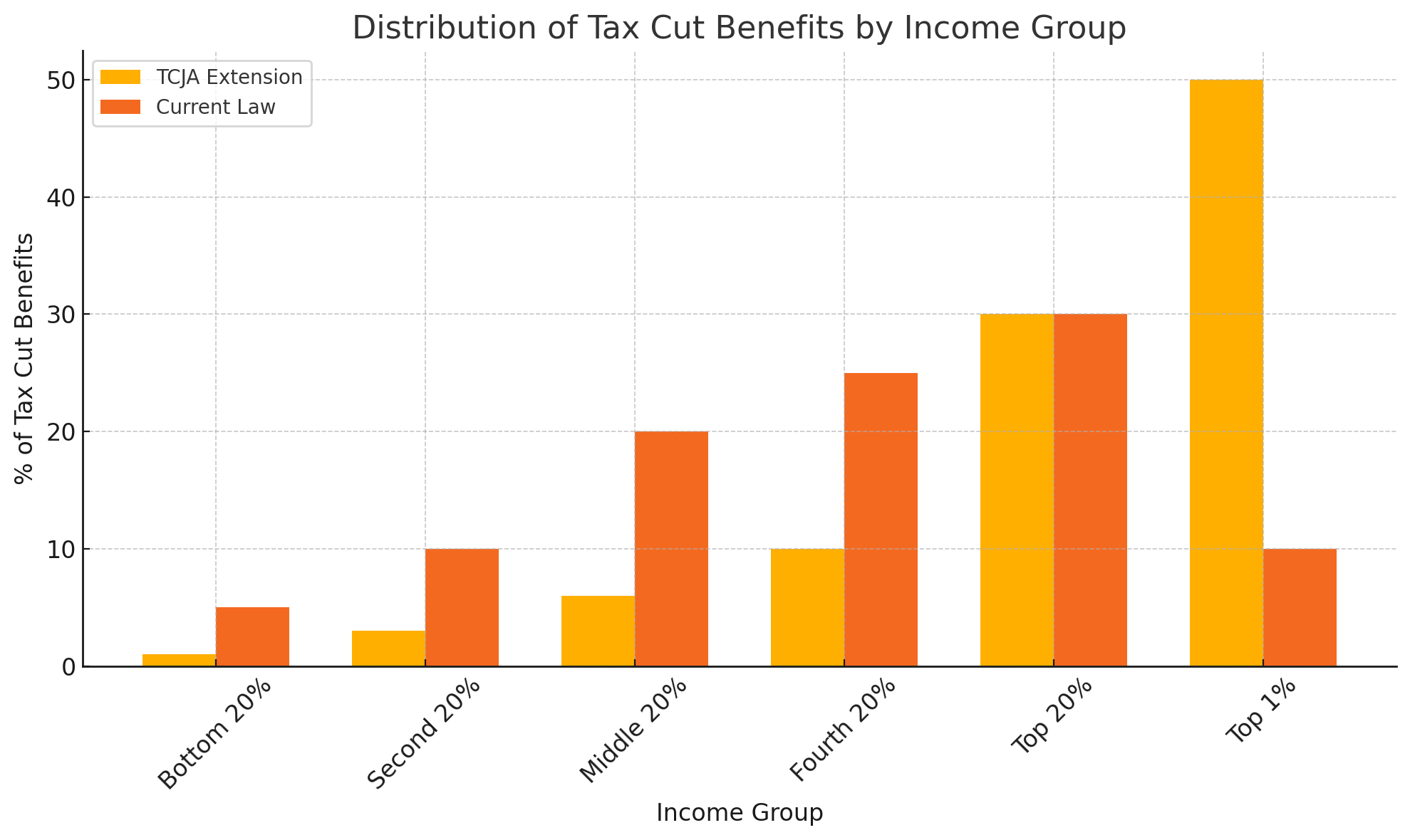 (Chart: Distribution of Tax Cut Benefits Under TCJA Extension vs. Current Law) – A comparison of the share of total tax cut benefits by income group, illustrating that under the resolution’s tax proposals, the top quintile (especially the top 1%) would receive the bulk of benefits, whereas the bottom quintiles see minimal gains. An alternative policy scenario (e.g., extending tax credits for low-income families instead) would show a much more even distribution favoring the middle and bottom.